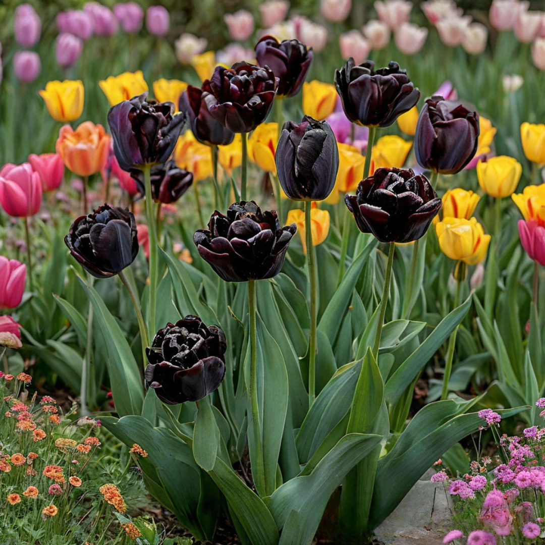 Махровый тюльпан «Рейдинс Дарк» – это уникальное растение, которое станет настоящей изюминкой вашего сада. Высота растения достигает 35–45 см, что делает его идеальным для создания ярких цветочных композиций. Листья насыщенного зеленого цвета, крупные и широкие, придают «Рейдинс Дарк» эффектный вид. Основная характеристика сорта – его темный, практически черный цвет цветков, который особенно притягателен в контексте весеннего цветения.